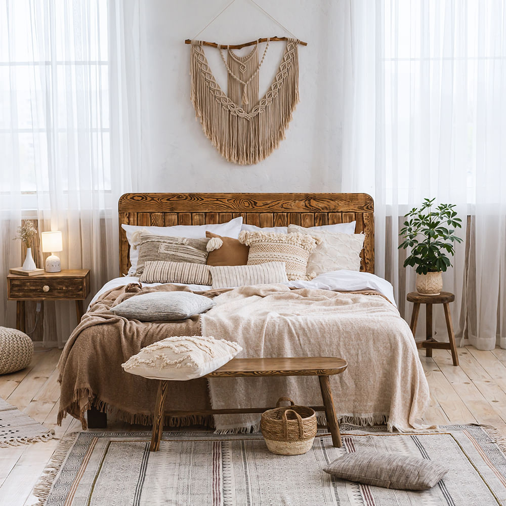 All white walls can seem boring, however, if you're someone who likes adding and deleting elements from your space ever so often, consider having a plain white wall as your backdrop in the bedroom. You could add macrame art, install sheers to bring light in every morning and create an earthy sanctuary with the right furniture. You could add board and batten or geometric patterns with wood if you find the all-white lacking some dimension.
