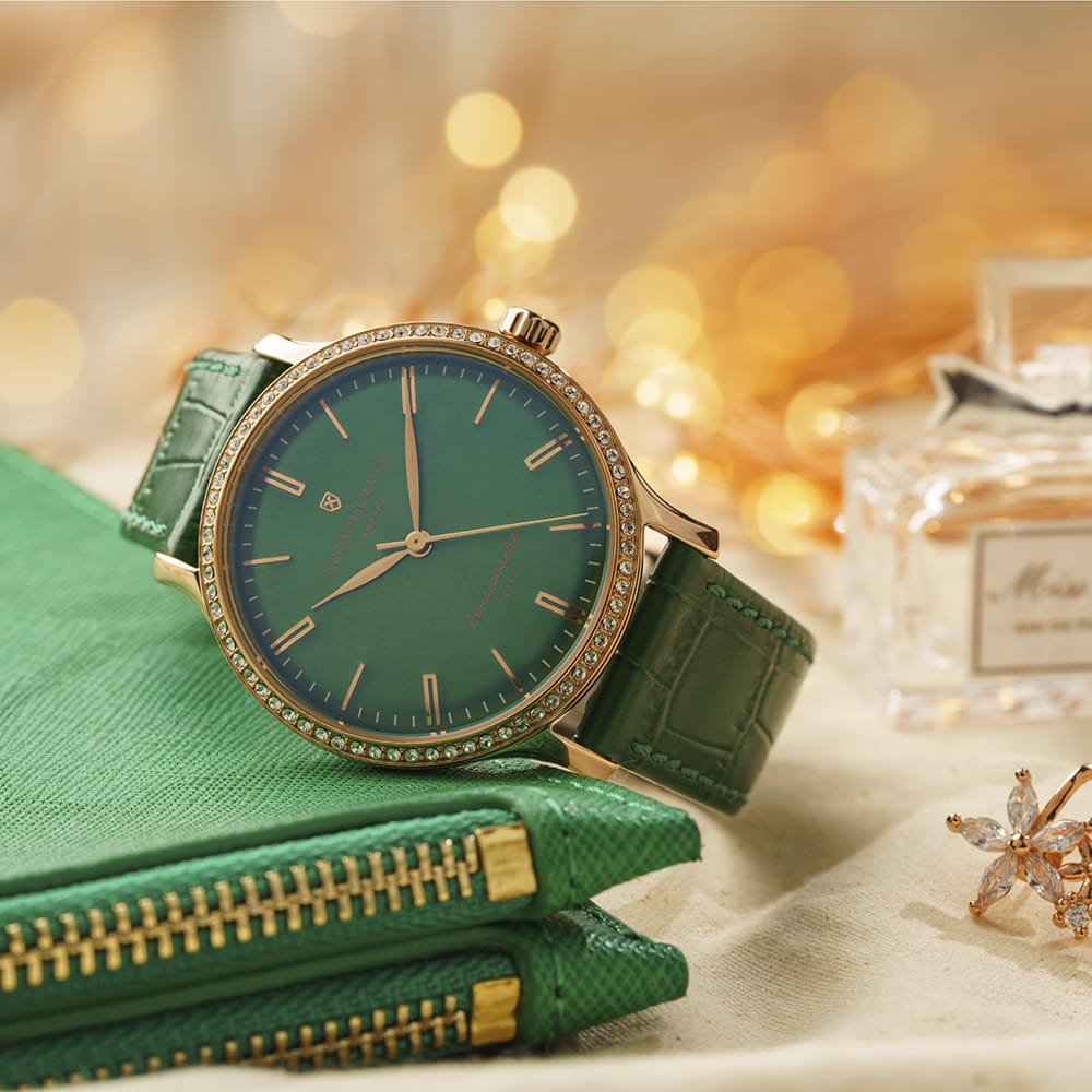 The collection has a total of five timepieces — three of them in rose gold plated stainless steel and two in stainless steel. There are also three dial variants: Opaline, Anthracite, and a unique Emerald. The watches are all made with surgical grade steel, scratch-resistant sapphire crystals and a slim case design adorned with 72 Swarovski crystals. And that's just the design. The movement is as enticing, with Swiss quartz movements. All this is held in place with genuine leather straps and presented in beautiful lacquer-finished wooden boxes.