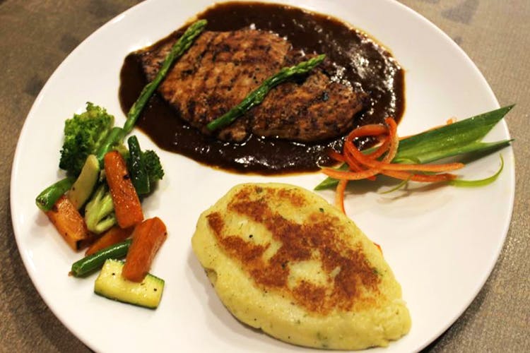 We tried the chicken steak as well as the chicken sizzler. Both the dishes were up to the mark. The steak was nicely done and the sauce was flavourful. Plus, the Mexican rice that it comes with was yummy. The sizzler was fresh and hot, and the veggies served on the side, had the right crunch. We tried a couple of mocktails that were decent enough. The desserts are really nice. We tried the signature Raindrop Cake and it was quite subtle and delicious.