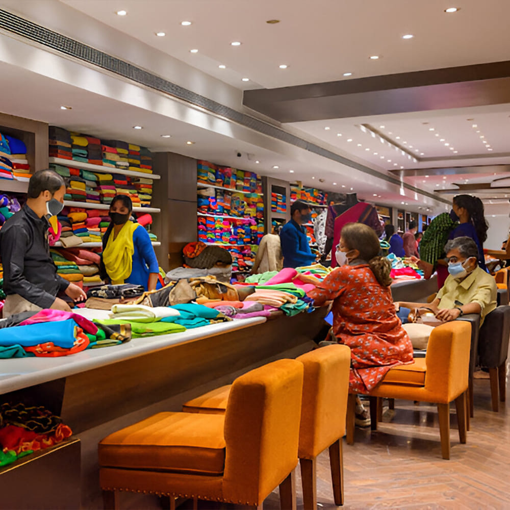 If you’re looking for something really festive but budget-friendly, try Mysore Saree Udyog. Their collection of Bandhej lehengas is perfect for any festival. In bright colours like red, green, orange, and pink, you’ll stand out without being OTT. They also offer a selection of chiffon, velvet, and raw silk lehengas that are high on class and low on bling. And the best part? Prices start at INR 2,500.