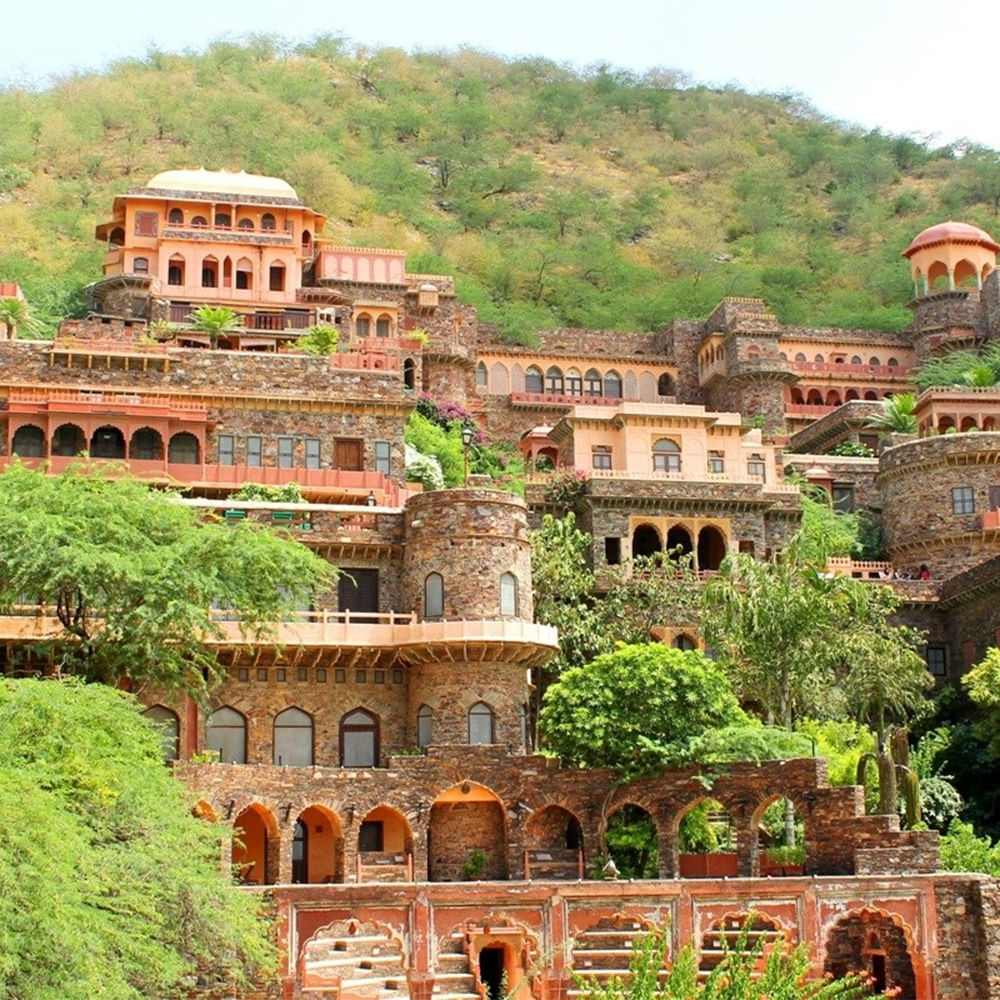 Set off on a magical ride to the 15th-century heritage hotel on the Delhi-Jaipur highway. With seven palace wings, it really is one of the most interesting hotels to be created from what was once a warrior’s fort. Built on several levels, the architecture means you can swim out of your room to join the larger pool or just wade in the cove around your private space. Hanging garden walks, historical and mysterious hikes take you nine floors underground, while upwards treks see you conquering dunes that have stood the tests of time. For the adventurous ones, they have the first zip line tour in the world, and you can have an aerial view of the town below. Built on the two-million-year-old Aravalli Hills, this 553-year-old fort, turned palace hotel, is conveniently located on the Delhi-Jaipur highway. It has been installed with lifts to explore the two-tiered property, but the entire architecture will take you back centuries.