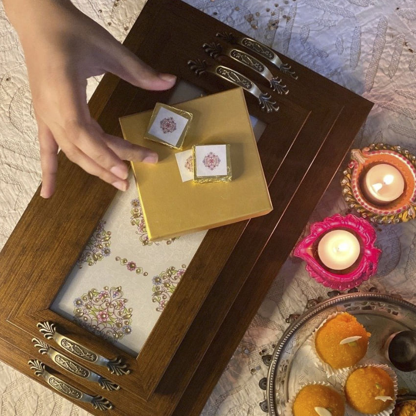 A gifting brand through and through, you're sure to get a festive gift set that's appropriate as it is useful and tasteful too. Their hampers include a mix of trays, chocolates, coasters, candles and diyas across budgets. We specifically loved their trays and chocolate hampers, starting from INR 1,300 as these are not too extravagant and yet, make a statement. Prints of peacocks, banyan trees and mandala-cum-rangoli artowrk on the trays, coasters, and candles are what make these gift hampers, perfect presents. Read more about Footprints Forever here.
