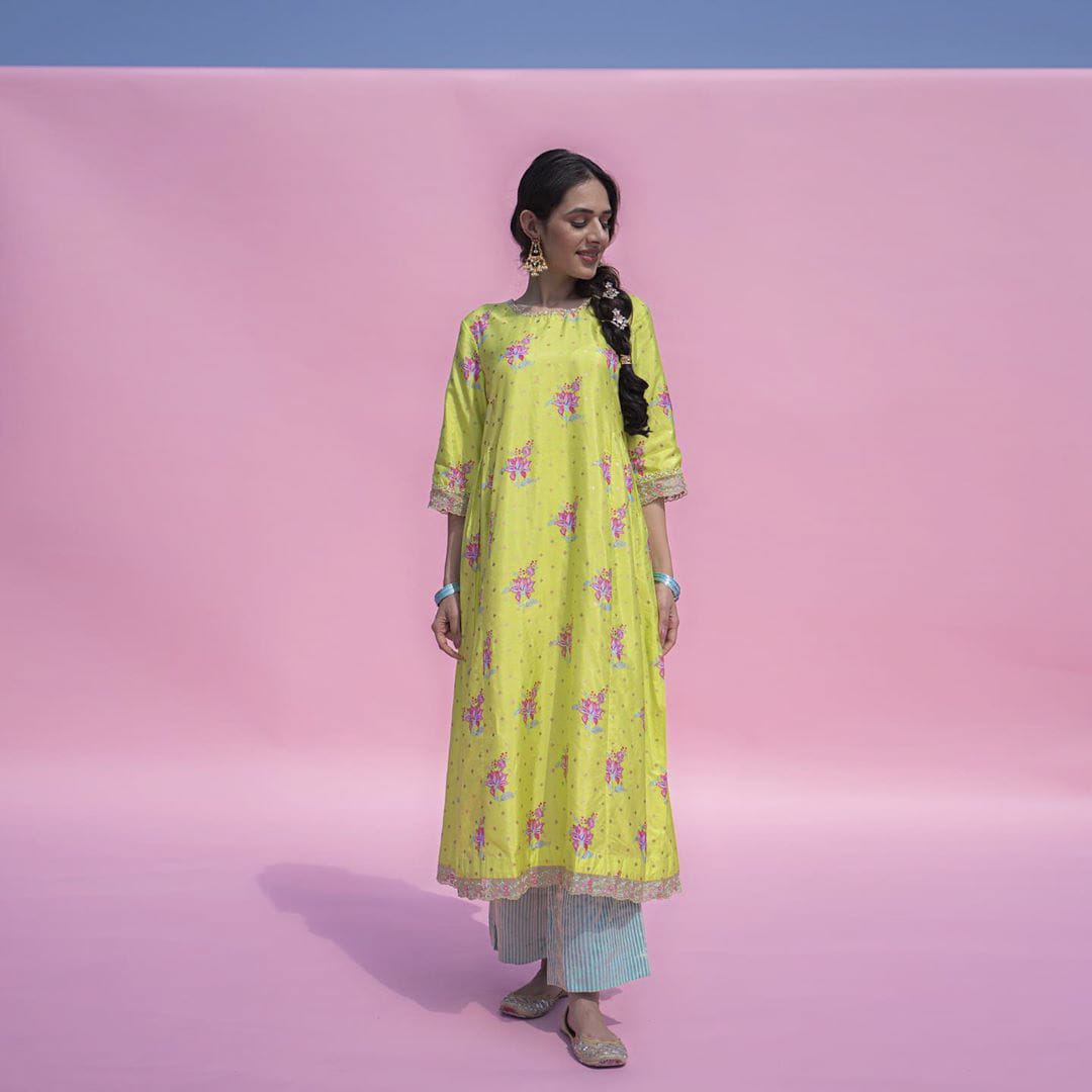Find kurtas made out of silk mul mul, tissue chanderi, and chanderi silk in colours like bright pink, purple, yellow and orange among others with delicate floral and Indian prints. Pair them with pants made out of cotton silk and handlooms and organza dupattas with intricate hand embroidery. Getting married and looking for an outfit for your haldi or reception by the beach? Find lehengas made out of raw silk and sarees accented with in-house prints, applique, and hand embroidery. You can also get individual pieces such as blouses, sarees, and kurtas and you can mix and match them to create their own look. Their crop top blouses is the latest hit with shoppers. These can be worn as a crop top of course, but they also double as a lehenga and saree blouse. The designs and colours on these are quite out there, so be sure you'll be making a statement, especially when you wear this as a crop top.