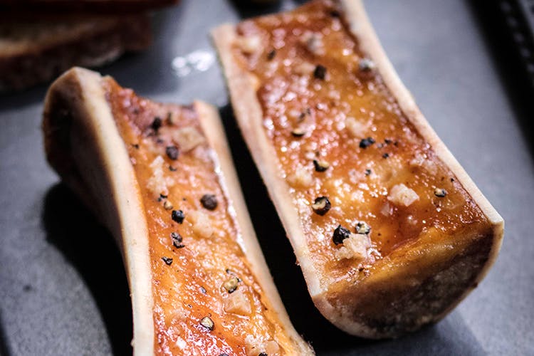 Everyone from food critics to the aam aadmi are unanimous in their praise for Bangalore’s hottest, new restaurant — The Smoke Co. The crowning glory of the deliciously meaty menu, here, is the Smoked Bone Marrow. Sprinkled with flakes of sea salt and olive oil, the smoked marrow {served with sourdough toast} is rich, gooey, and is a umami worshipper’s delight.