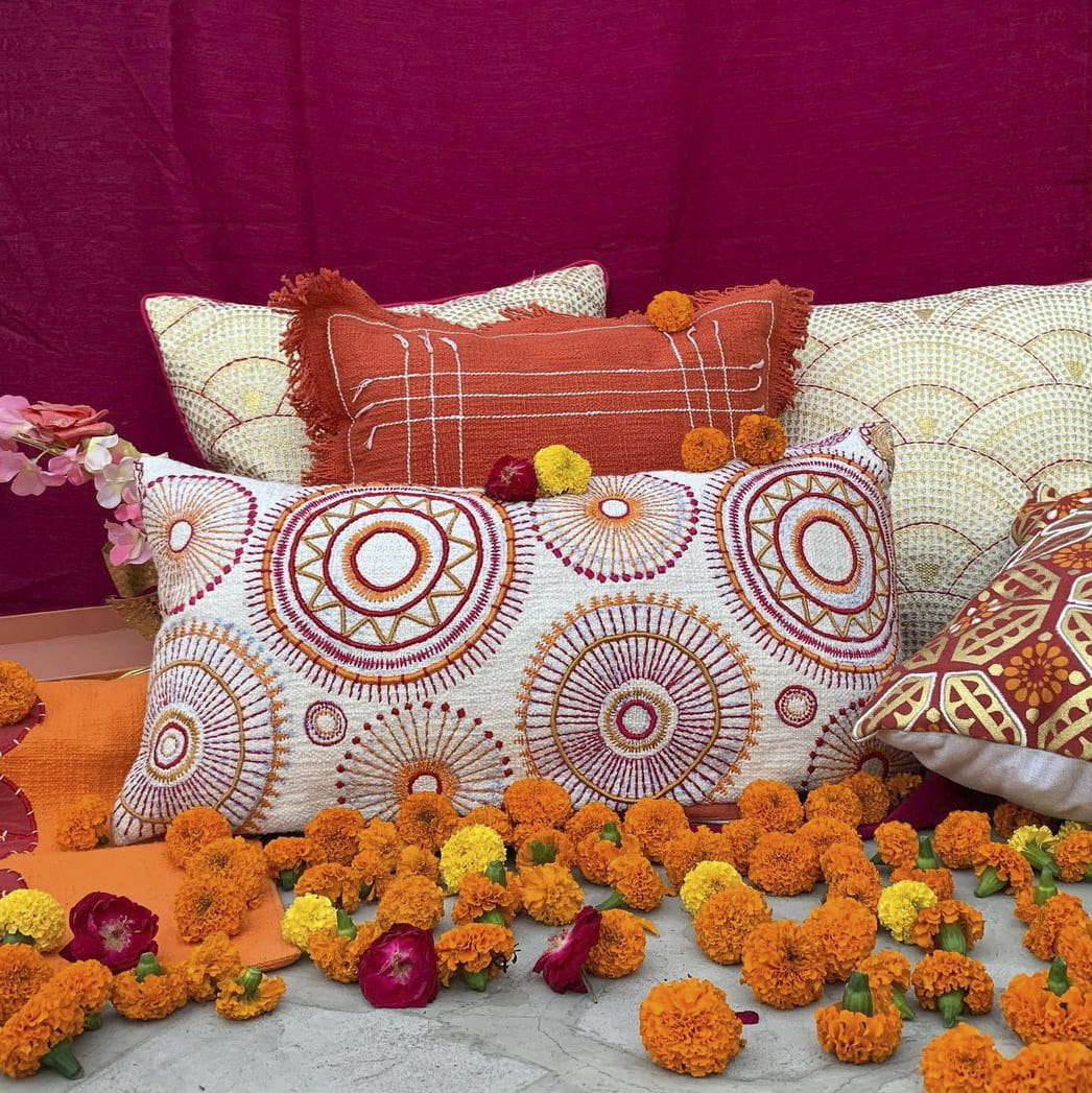 Don't go the matchy-matchy route, instead experiment because you have enough to do so. Like, use the rich velvets for when you're after that royal vibe, specifically the appliqued dark covers or you could just go with different velvet solids for a statement feel. When a festival or wedding comes a-knocking Ardor Indie's Utsav collection is apt. The colours too, mimic festivities -- marigolds, deep rose pinks, dull golds and much more. These also range between being minimally or heavily embroidered, so you can take your pick. We really like the textured and ribbed pillowcases as well as the vintage floral velvet covers with a touch of embroidery.
