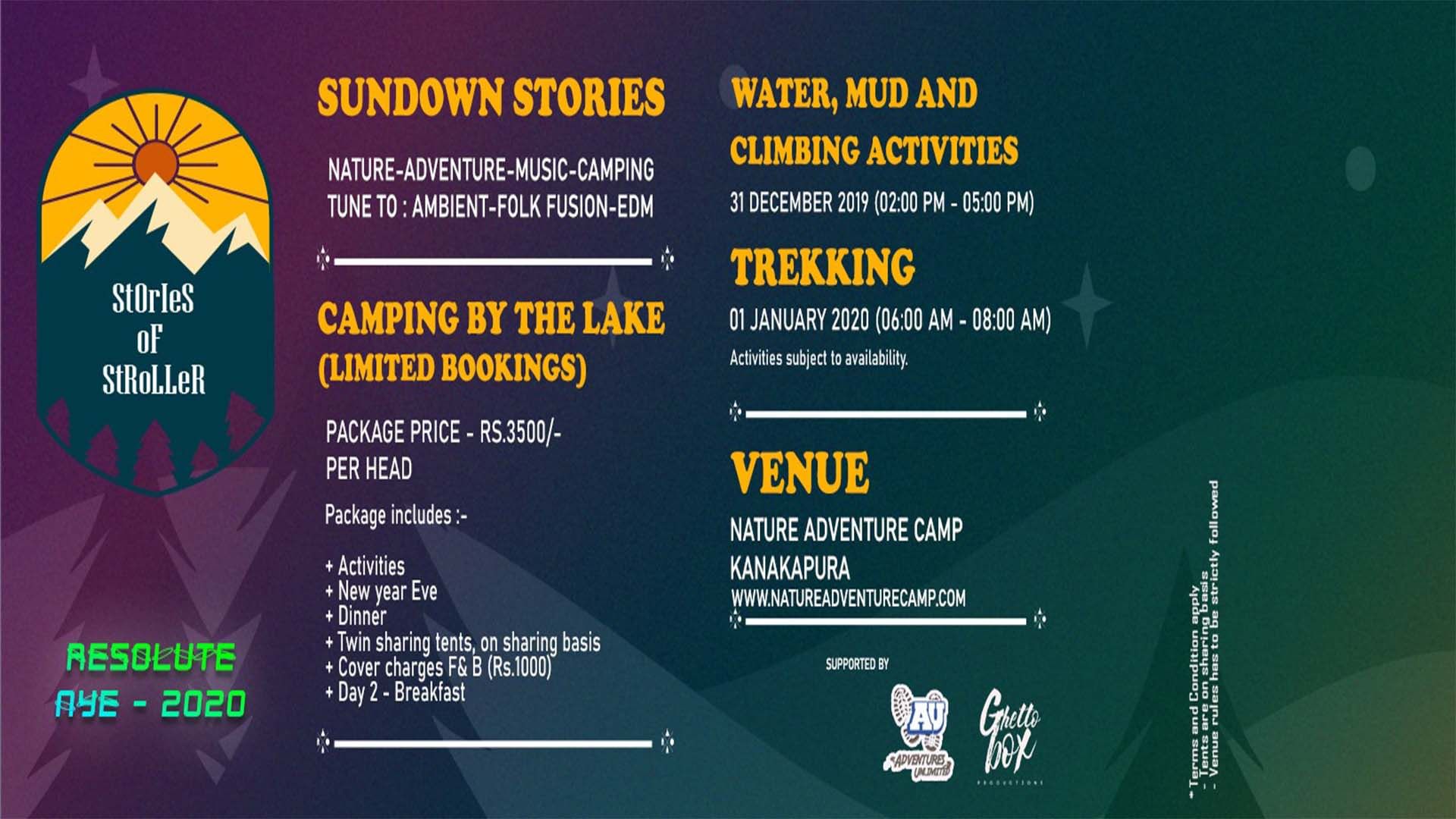 Want to party into 2020 in the lap of nature? Then you have to be at the Nature Adventure Camp in association with Ghetto Box Productions Presents Resolute Stories of Stroller NYE - 2020. With Live Music, Bar & Barbeque by the lakeside, it'll be an event to remember. The music will be Ambient, Techno, Live Fusion Folklore Band Performance & EDM, featuring DJ Naveen. DJ Nikhil, Dj Ranzy, Frantic Mind & many more