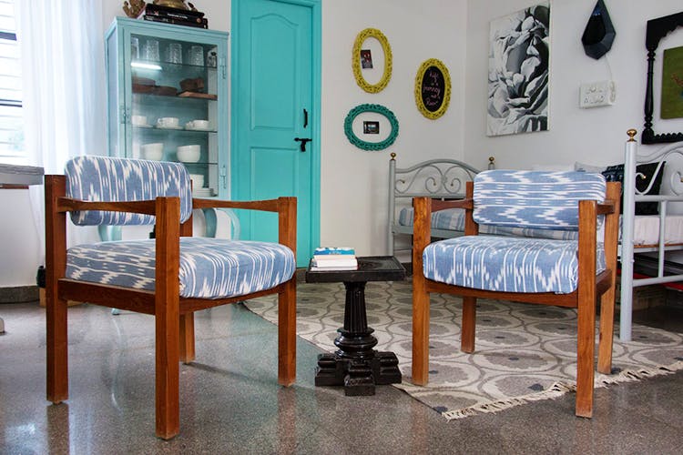Another store Prabhu frequents is 5th Cross Antiques in central Bangalore. Prabhu picked up the chairs from there for a steal. However, to given them a more contemporary feel, Prabhu hit the fabric market at RC Puram. She looked around and found metres of gorgeous ikat for a steal {INR 100 per metre} and used it to reupholster the chairs. Since the chairs didn’t need complicated upholstering, she did it herself armed with nothing more than a staple gun. You can too, she says. But those who can’t be bothered to DIY, you can always get your chairs upholstered by your local carpenters. Almost all of them offer this service.