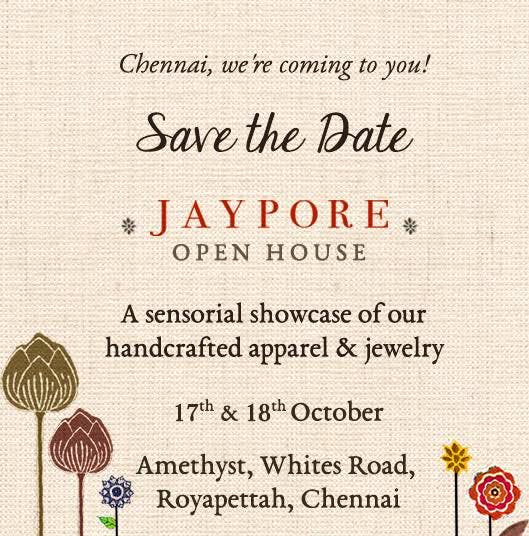 Jaypore's Open House in Chennai will display a curated selection of the Jaypore Label ethnic & contemporary women's wear apparel, silver & fashion jewellery, footwear, clutches and personal care & beauty products.
