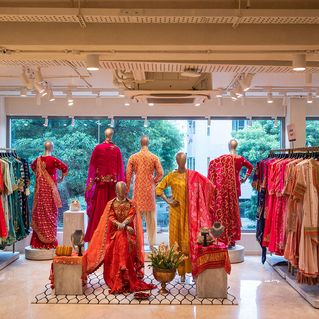 What we love about Pernia’s is that it is a one-stop multi-designer store that has exquisite collections from Indian designers that are on top of the game. We’re talking about Tarun Tahiliani, Falguni Shane Peacock, Dolly J, Amit Aggarwal, and Gaurav Gupta for starters. Expect pret-wear like mirror-embroidered lehengas, fusion sarees, and alluring chanderi kurta sets. Since it’s a one-stop store, you can also amp up your looks by pairing your outfits with their range of footwear and accessories like sequin-embroidered potli bags, hand-embroidered clutches, neck pieces, juttis and signature heels.