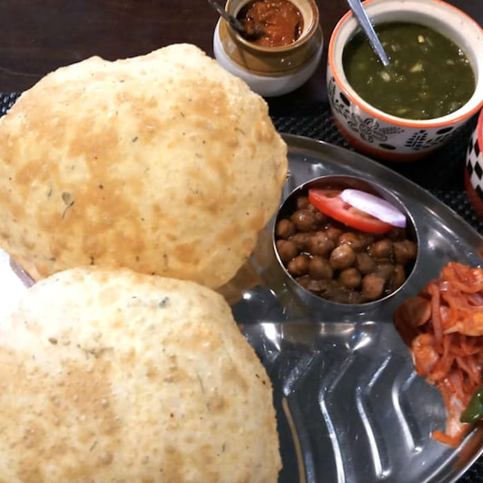 Boasting of a kitchen run by apparently sixteen chefs, straight from Punjab, Bhangra Punjabi Dhaba has quite a fan following for its chole bhature. Served on a massive thali, the chole bhature here come with fried green chili, raw masala onions, and tomatoes. They also serve freshly churned mint chutney and kulcha chutney that is a mix of ginger, tamarind, green chilli, and honey along with a pachranga acchar (a pickle made of 5 veggies) Priced at INR 140, the chola bhatura here is available from 12 pm to 12 am.