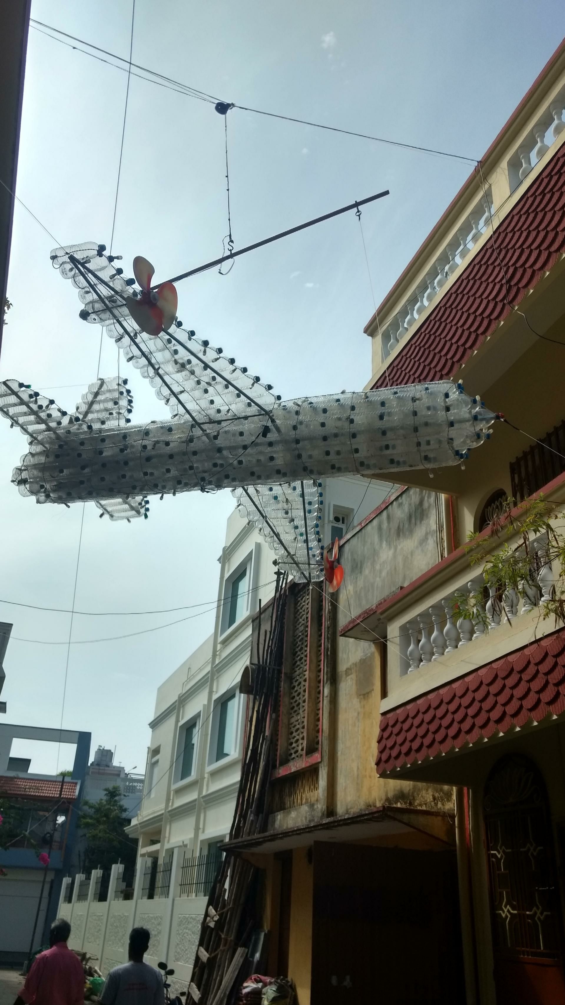 Mr. Mosel, a Tamil-French architect by profession, creates a unique new plastic sculptor every year. This year, it's an aeroplane and it's hung in one of the by-lanes of Mission Street, for all the city-zens to see! He does it as his passion, and during the evenings, the sculptor is beautifully lit up with pretty lights!