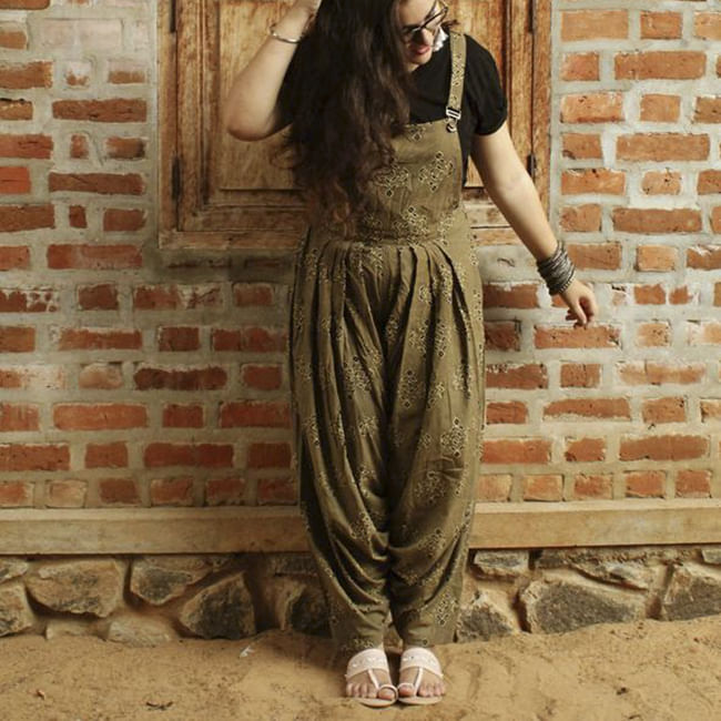 Their Ajrakh collection is our fave because of the versatile options it offers. From intricate Ajrakh dupattas and salwar suit fabrics to turn-down collar jackets and spaghetti tops in Ajrakh, Sikhat has some captivating pieces that beautifully highlight this craft of Kutch. For those of you looking who are looking for something unconventional, check out their Dungaree Patiala and Khaki green, draped kurti as it beautifully blends two different silhouettes to create something edgy. Prices for these start from about INR 2500.