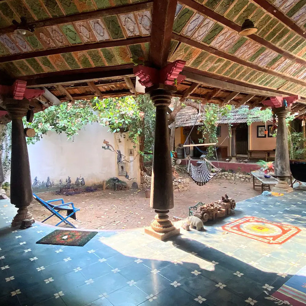 Another Chettinad-style house, the Wunderhaus gives you a traditional welcome and yet fills the air with hostel vibes thanks to its quirky wall art on the sidewalks. With Tibetan flags, sewing machines, a huge collection of brass objects and plenty of plants, this Airbnb is an artistic visual treat for travelers. It is known to be most suitable for solo travelers and writers too, if they’re looking for some inspiration. Small and colourful rooms, hammocks, organic breakfasts – if all this sounds exciting to you, then get here quick! And yes, it is pet-friendly too!