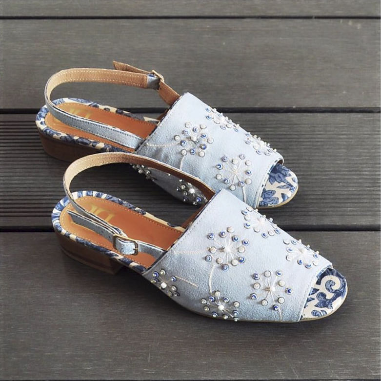 Our personal favourites are their Bead & Sequin Pastel Blue Sandals, and Floral Fringe Sequin Suede Flat Mules. The pastel blue sandals are wonderfully crafted with just the right balance between colour and embellishment, and the fringed mules are stylish enough to light up a basic white shirt and blue jeans combo. The embroidery they have on each of their footwear is so finely done that you won't be able to take your eyes off it.