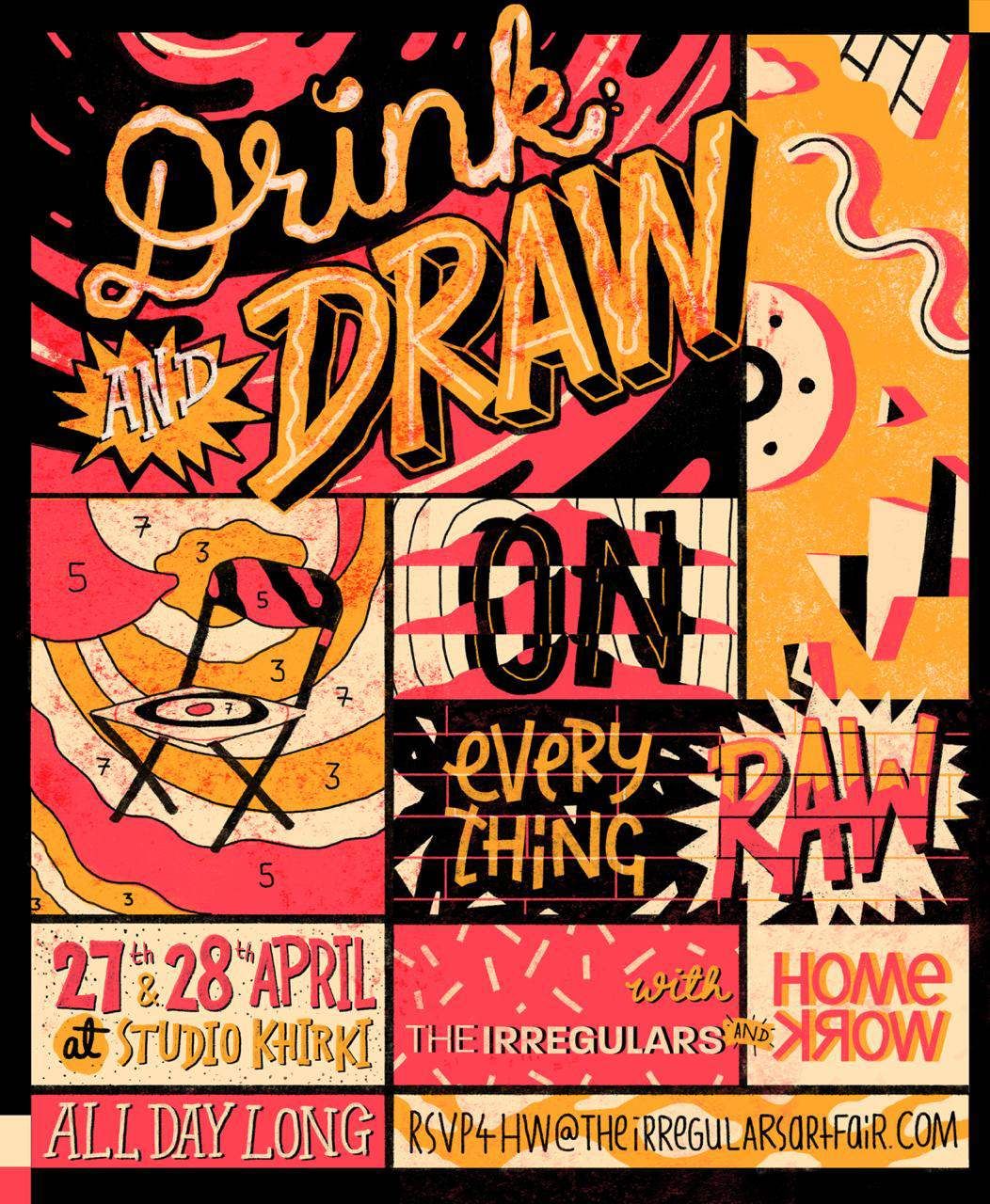 Come be a part of our drink and draw workshop where we draw directly on all the raw materials that we have saved from every show done at Studio Khirki."