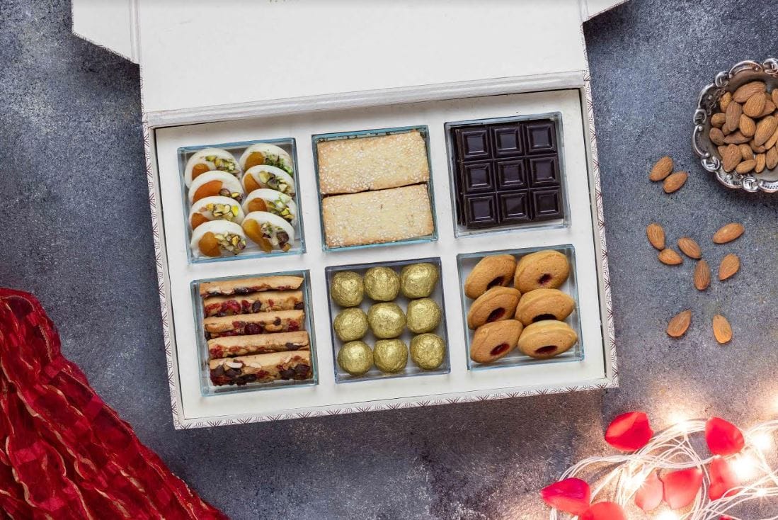 After these, they've also got The Luxury Box, which consists of goodies like milk chocolate apricot and pista, peach candy, peanut cake, white chocolate bar, sichuan pepper cashew nut, cherry financier and candy & more. And, last but not least , they've got The Executive Box (Box of 12) which has sesame sable, gianduja praline, pistachio raspberry macaroon, coconut jam tart, raspberry pistachio friand, patisa, granola bar, single origin chocolate truffle, sichuan pepper cashew nut and peanut cake.
