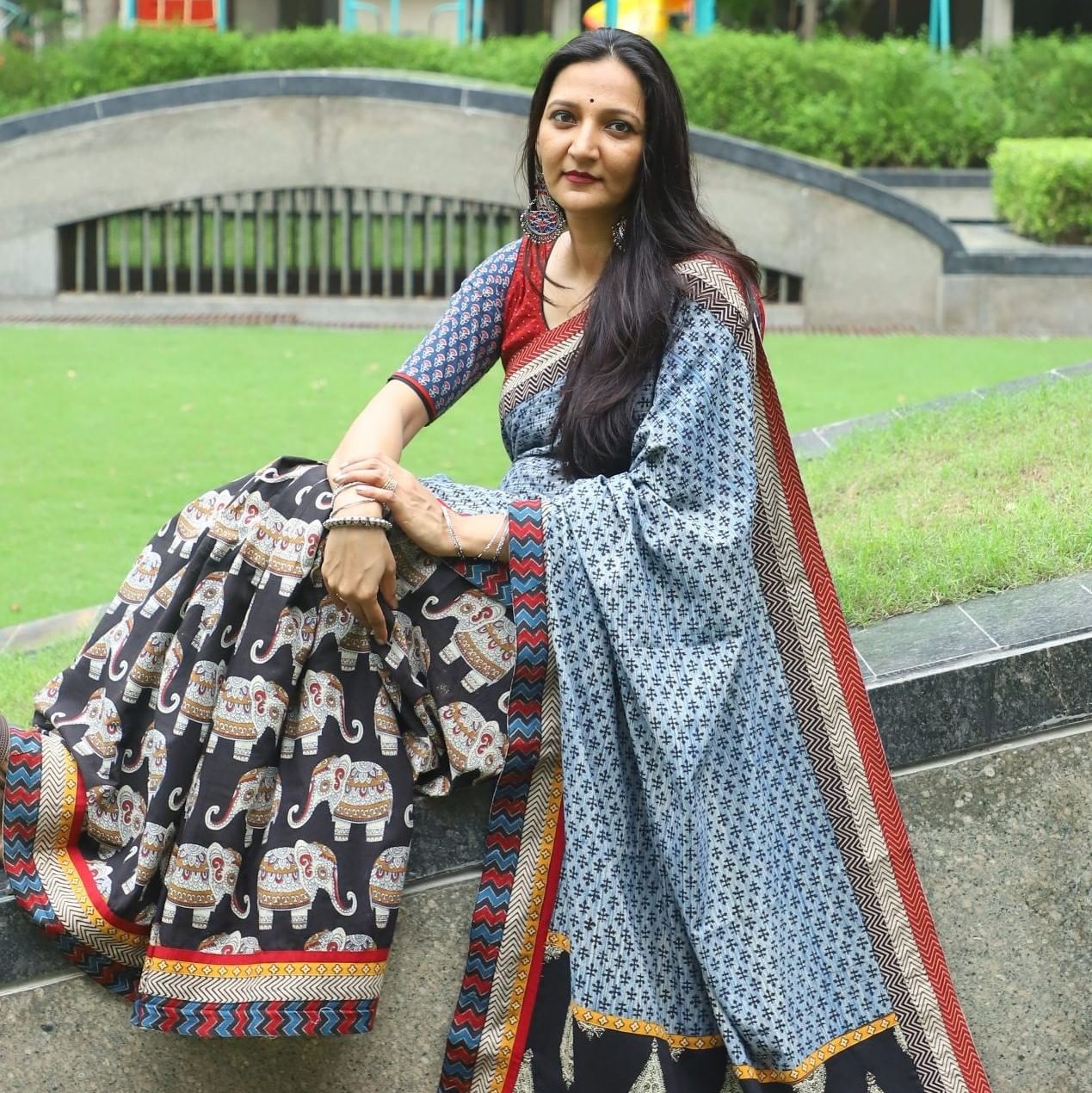Wondering what to expect? We found Bandhani blouses with mirror work, Chanderi sarees paired with a zari striped blouse, handblock fusion saree with ajrakh and coin block print, silk patola print blouses and much more.