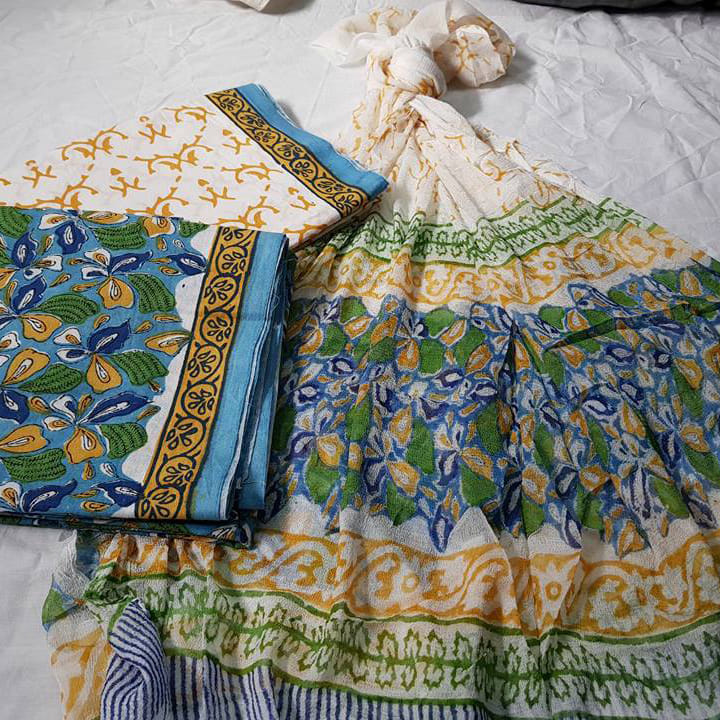 We loved the pure linen dress materials with vegetable dye. Coming in earthy hues, you can get them stitched in kurtas and you are good to go. Similarly, they have beautiful cotton ready-made kurta sets with chiffon stoles. Also, you will love their dupattas with hand-block prints.