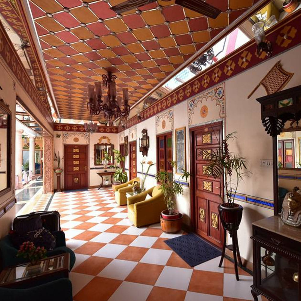 An ornately decorated heritage home, this is a colonial-style Rajasthani palace that has magnificent Rajasthani frescoes and murals in bright colours ranging from blues to yellows and greens, on the walls and ceilings with lots of mirror work. They also organise shows if you want to experience the culture of the state.