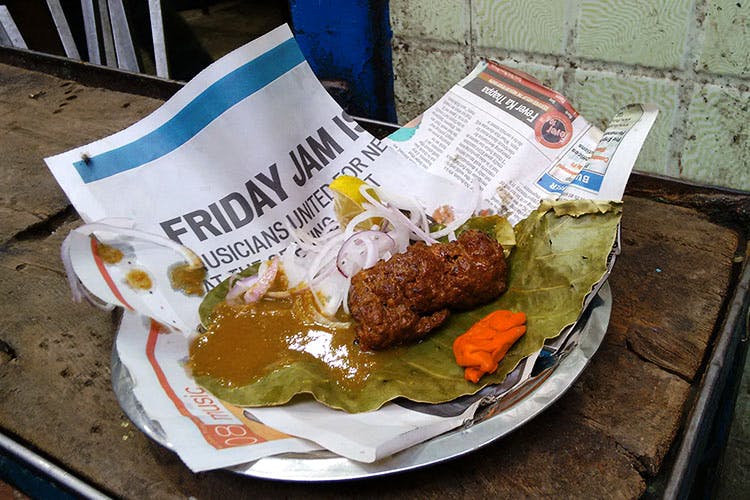 For the uninitiated, they’re popular for their sutli kebabs: Kebabs so soft that they have to be held together with a twine of thread. You actually have to hold the thread tied over the kebab from one end, and it spreads on your plate when unfolded. They’re served on a green leaf, with radish and mint chutney. Sigh.