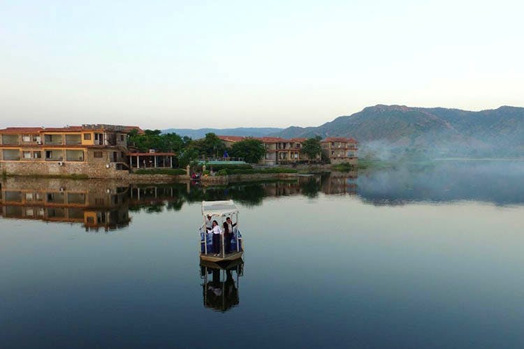 Each room has private balconies overlooking the lake, a view that can be taken in from the tubs in the bathrooms too! The buildings have a rustic, cottage feel with spacious, plush rooms inside making it the perfect place to enjoy the peace and quiet of the area around. You could also cool down in the infinity pool overlooking the lake or share stories around the bonfire at the resort. The hotel restaurant, in addition to its regular dishes, also serves traditional delicious Rajasthani food that'll satisfy you to the core.