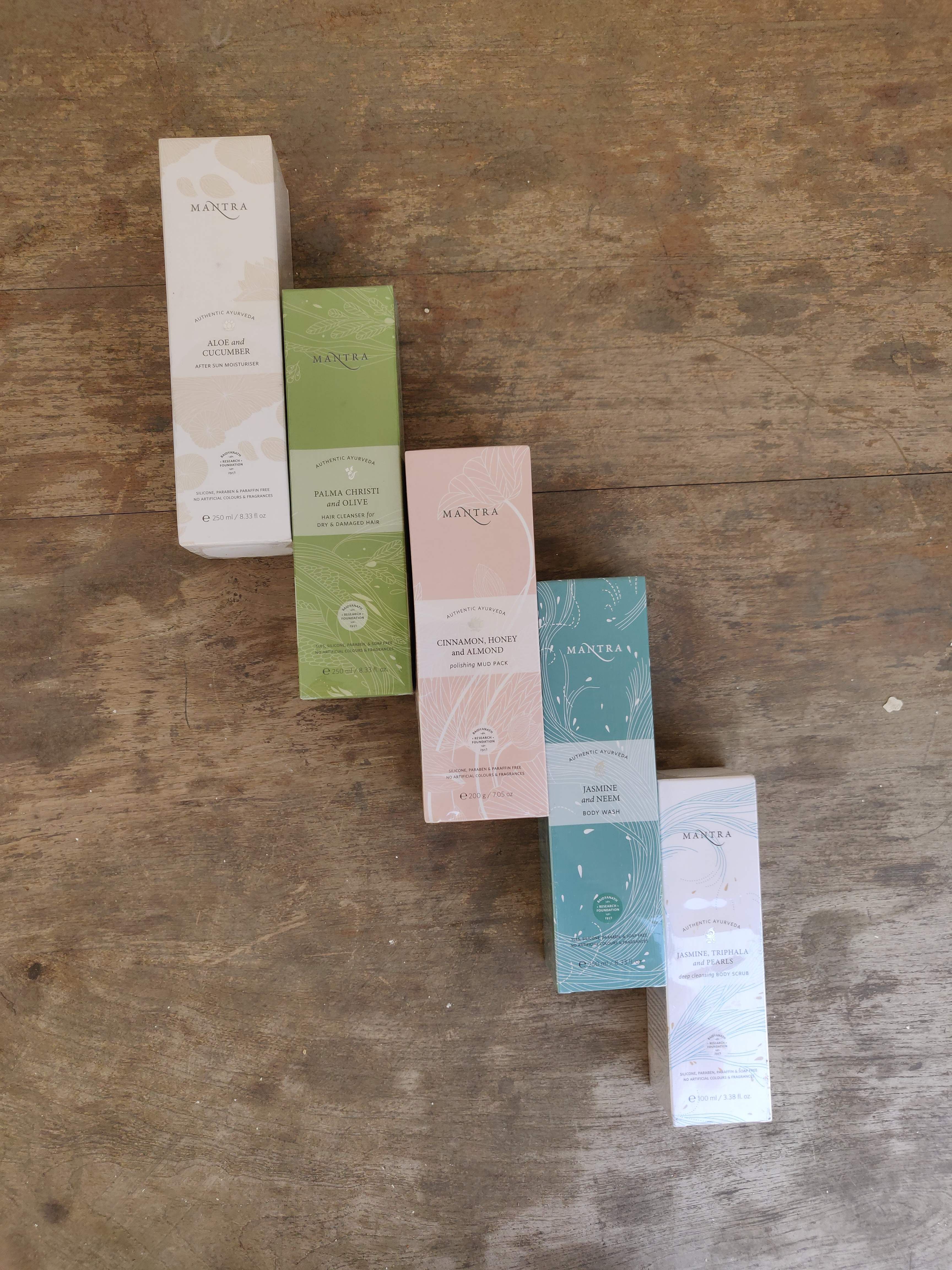 I tried five of their products—the Jasmine & Neem body wash, the Jasmine, Triphala and Pearls Body Scrub, the Aloe & Cucumber After Sun Moisturizer, Cinnamon, Honey & Almond Polishing Mudpack, and their Palma Christie & Olive Hair Cleanser.