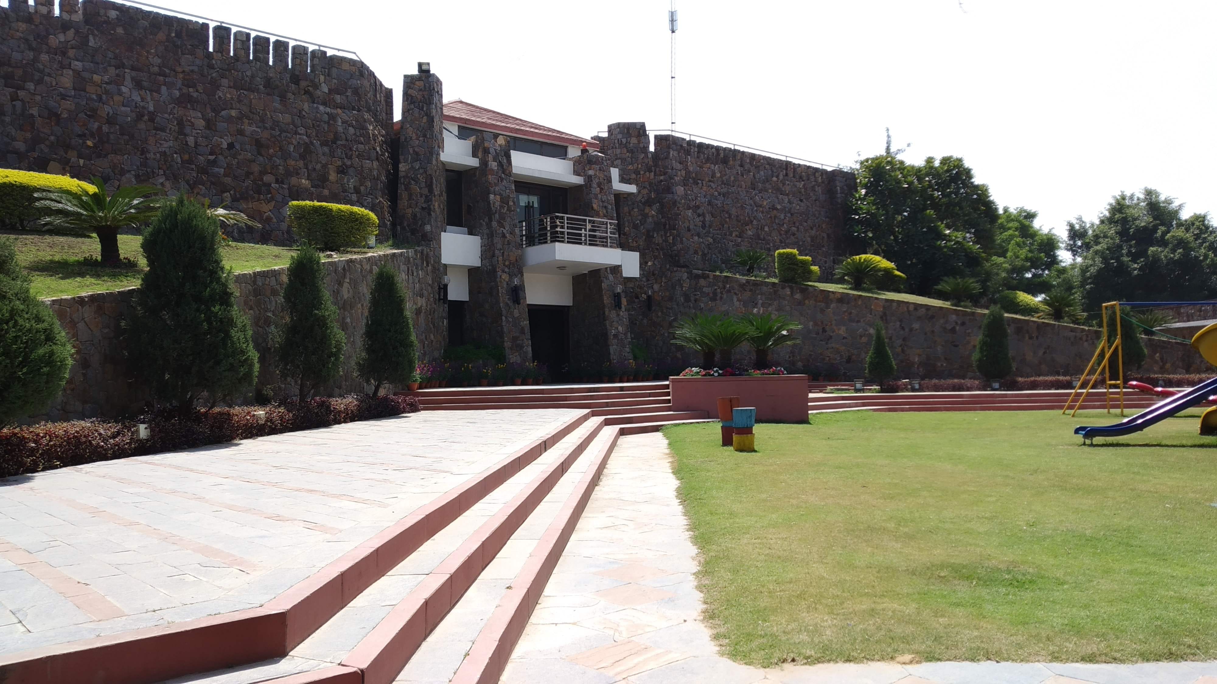 You enter and there are green circles you drive around. On your left is a golf course. Little golf carts at the entrance tempt you to explore the grounds on wheels. A grand Mewati welcome meant 6 men dressed formally play a fanfare as you walk up the steps to the reception desk.