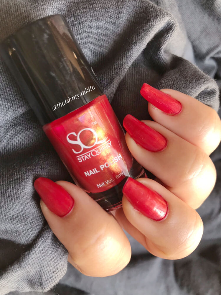 🌸Review- I got this nail paint as a free gift with my Stay Quirky order and I really loved the finish of nail paint. It gives the gel shiny matte finish look on your nails. Very smooth in application and it dries out quickly. It also gives a two-toned color finish( red & pink) as you can see in the pictures.