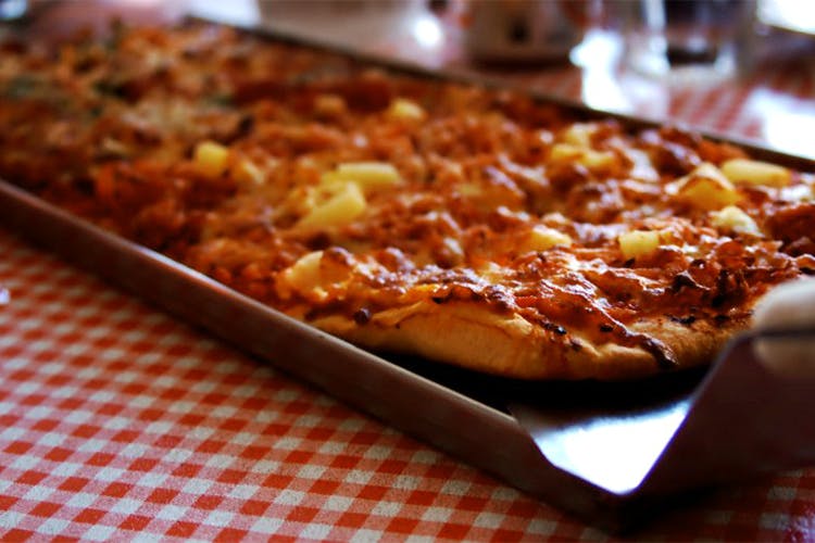 Made by combining three square pizzas, the ‘One Metre Long’ is a thin crust treat with the chops to make you drool. You can choose any three pizzas from the menu and any combination works—all non-veg, 2 veg one non-veg—you get the idea. They’ve got variants like Beer & Chipotle Chicken, Garlic Oil Pepperoni, Basil Three Cheese Pesto and more.