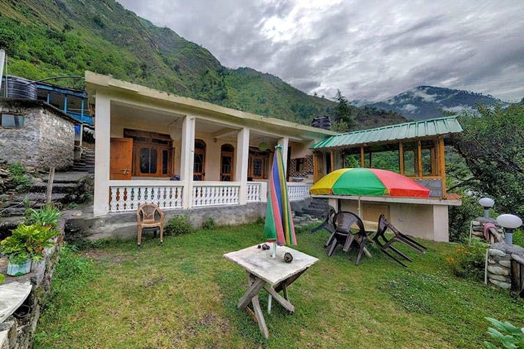 We’re digging this unpretentious place in Gushaini, which is cut off from commercialisation. It’s got a dining hall—an odd protrusion from the house which lets us eat all our meals facing the mountains, wherever we look. This is, of course, if you need a change from the lawn, where you’re probably going to laze around. The staff’s happy to cook for you for extra charge, or you can always have someone from the group taking turns. On the other hand, if you’re an active camper, you can cook your own meals, too.
