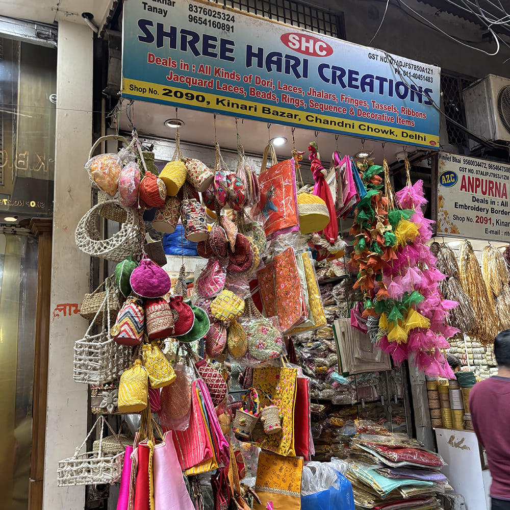 Shree Hari Creations is one of the cutest Kinari Bazar shops that is fully stocked with zari goods, laces, bags, pouches, jhalars, fringes, ribbons, doris, tassels, and even accessories. They have got all the decor items for festivities, like for Holi, they had some really nice hangings and baskets.