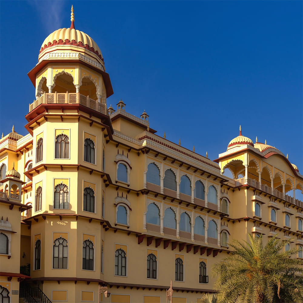Just a short drive from Delhi, ITC Grand Bharat offers a luxurious getaway to unwind in style. Set amidst the ancient Aravalli Range and spread across 300 acres, the resort honors India's glory with an architectural blend of ancient, medieval, and modern influences, featuring royal pavilions, ornate carvings, and domes. The expansive property includes 100 suites, four presidential villas, and elaborate culinary experiences. You can choose rooms with a private terrace or rooftop gazebo, while the suites come with their own living and dining areas.
