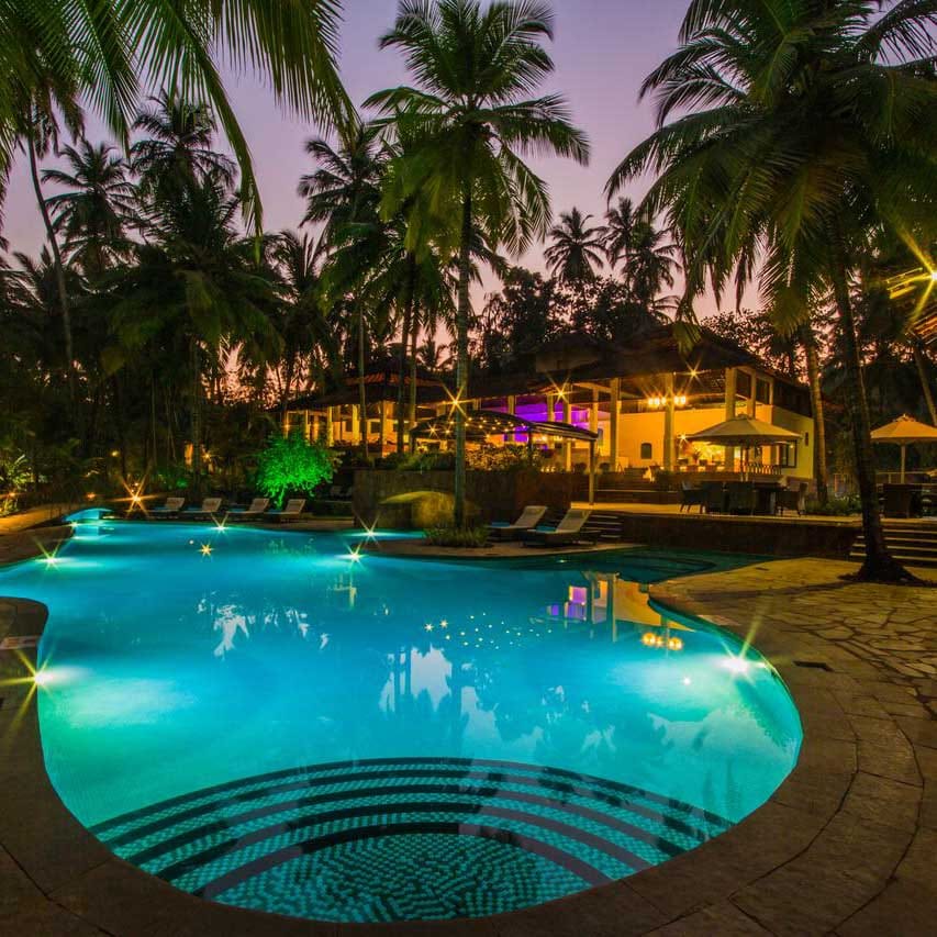 Coconut Creek Resort is located in Bogmalo, and is a 10-minute drive from the airport. It's a boutique resort that offers modern rooms, an outdoor pool, an in-house restaurant, free WiFi, yoga classes, massages at the wellness centre, a salon, currency exchange, and is a gorgeous property that also enjoys close proximity to the beach. They even have a library! Ideal for a romantic getaway, this hotel is located near the Goa airport, and is the ideal destination for those who wish to indulge in luxury, and don’t mind spending a bit on it.