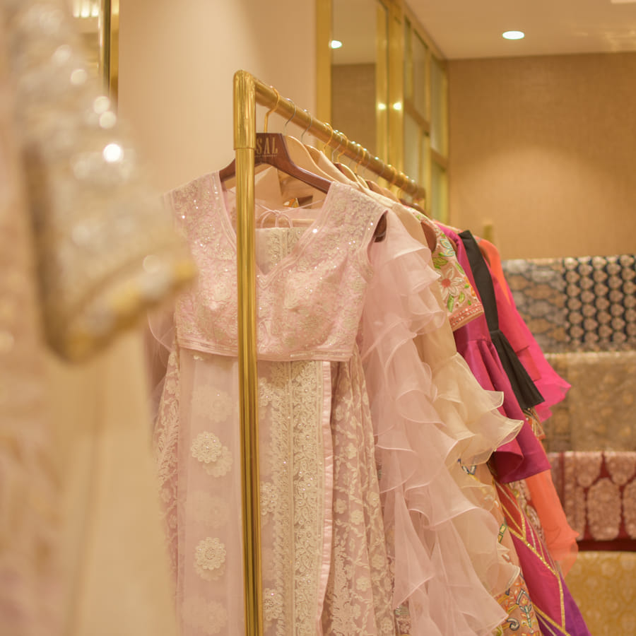 Once you reach the location, a grand brass-studded door with AJSK signature welcomes you on arrival. And once you step in, you will find outfits that are segregated into different sections. One is for sangeet/cocktail (women), there is a separate section for sherwanis for men, among others. You can find bandeau blouses, dramatic ruffled sleeves, lehengas in interesting shades like lemon yellow. So, go and get yourself an attire from this store of royal vibes.