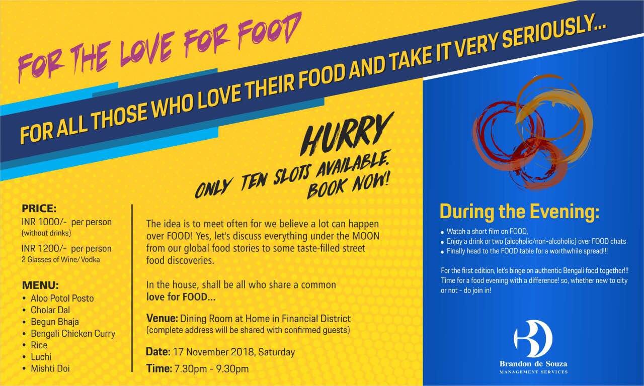 Discuss all things food on Saturday, November 17, 2018, as you bond with other food connoisseurs over some amazing Bengali food in the cosy setting of someone’s residence. Meet and interact with a new set of people who share the common passion and the same kind of love for food.