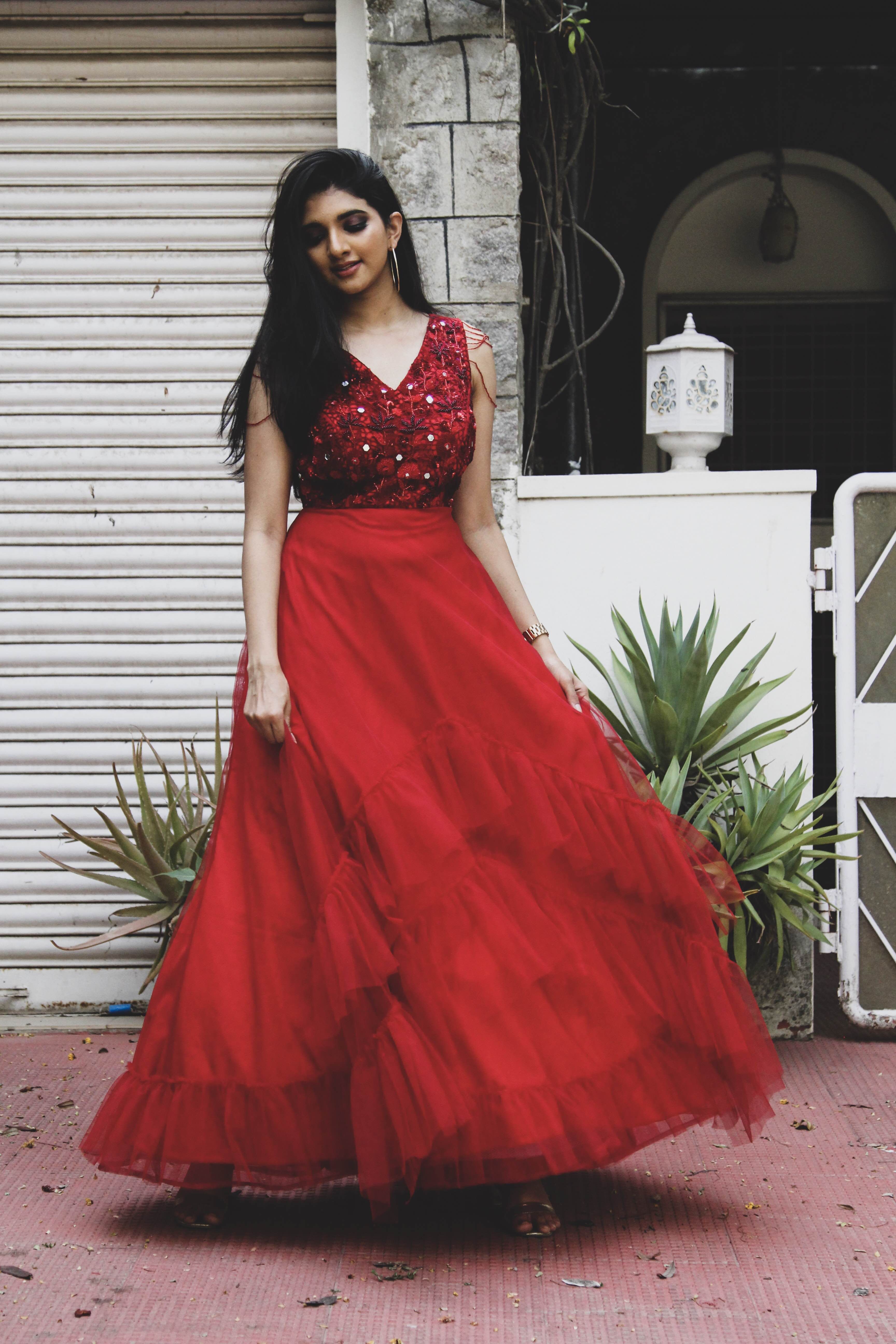 1) The gorgeous red gown is perfect for a cocktail party or a reception look.