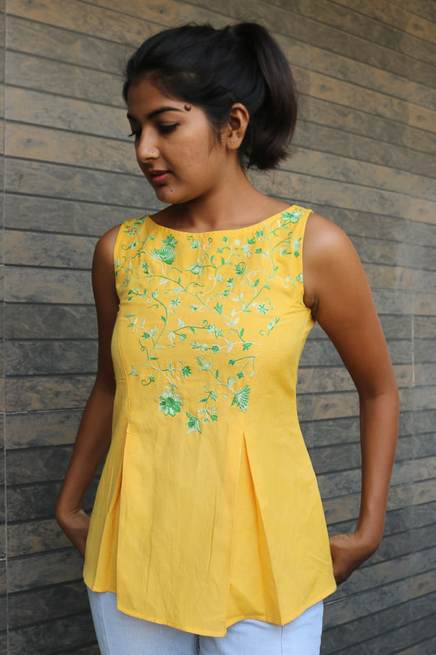 If chic and simple are your style, you will fall head over heels for Hastha Katha — a Hyderabad-based brand. Believing in the magic of handicrafts and Indian textiles, everything about this label is handmade. We spotted Kaftan dresses in pastel colours with minimal embroidery (keeping it classy), linen peplum tops, pleated dresses, and asymmetrical skirts. There are a few eccentric outfits like a linen dress with handpainted Ganesha artwork on it and boxy shirts with art handpainted on its pocket. The label also creates earrings and scarves, which can easily jazz up even plain and dull outfits.