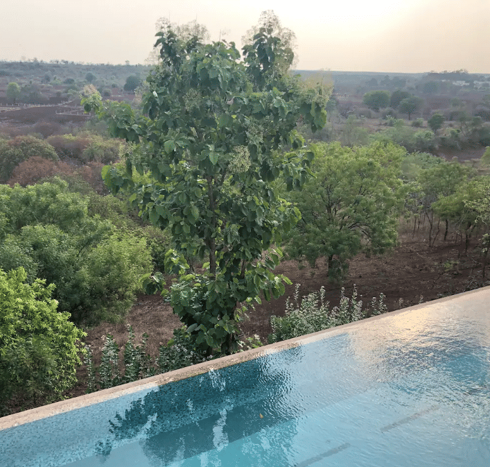 Away from the city's hustle-bustle, this place is perfect to catch pretty sunsets and relax. The villa as such has two bedrooms with big balconies, two bathrooms, a spacious hall with a TV, classic wooden furniture, and minimalistic wall decor, a kitchen with all the essential amenities, a deck overlooking nature, and a clean swimming pool. Not to mention, all the sanitary checks are in place and you and your guests will be taken care of with all safety.