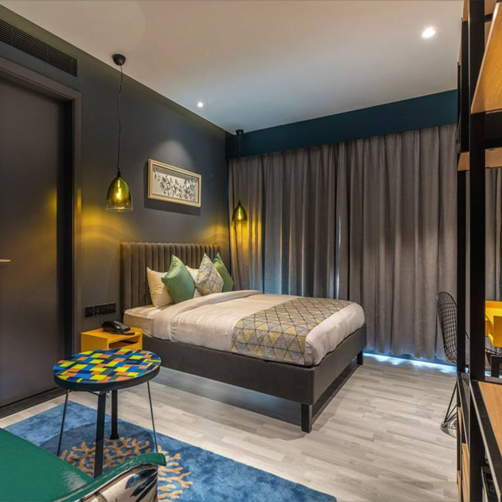 All the usual suspects like free WiFi, mini-bar, gym, and room service will make your stay comfortable, but what's the winner is their interiors. A burst of pop colours like neons, blues, and reds meet artsy decor elements like wooden carved faces and chandeliers. They offer four types of rooms — Deluxe (quaint and cosy), Premium (comes with an oriel window and balcony), Studio Room (comes with a kitchenette, park views, and a private dining space), Executive Room (more like a 1 or 2BHK). All the rooms are swanky and so Instagram-worthy.