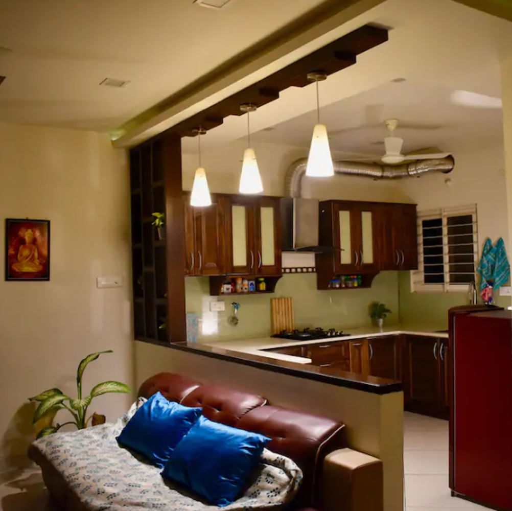 The fact that the homestay is located quite close to Botanical Gardens or Pala Pitta Cycling Park makes it awesome. No matter where you've got to go, this area is super well connected to all areas of Hyderabad. This is basically a one bedroom in an apartment that can accommodate two but you can request the host for an extra bedroom if you need. The entire apartment is Feng Shui designed and with plenty of sunlight gushing in, you can expect a super warm aura. Plus, the room has artsy corners with plants and wall art. While the room overlooks a lake, we recommend getting to the shared balcony for scoring better views of the lake. You can access the common kitchen and lounge room where you can watch Amazon Prime, Netflix, Spotify, Hotstar. And what's not to love? The hosts are mostly available for a chat and can help you plan your stay in the city too.
