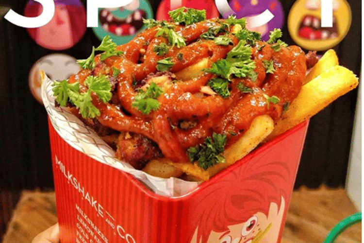 At Milkshake And Co., two amazing things come together — sausages and fries. Served in funky (and bright printed) tins, these fries are gooey. We love these as our evening snack with a milkshake or two. Plus, they look lit on our Instagram feed.