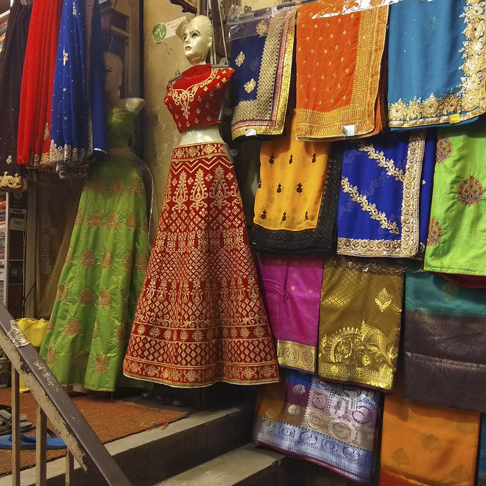 A fancy showroom with chandeliers and shiny marble flooring — they have a decent collection of sarees, suit sets, half sarees, etc. which are affordable if you're on a tight budget.