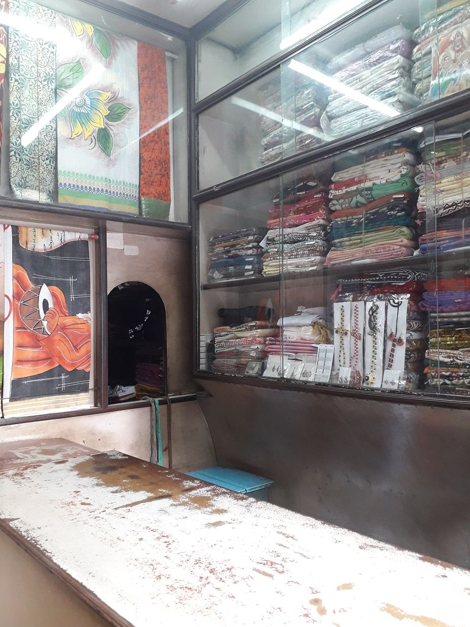 The owner and his aunty welcomes customers and can be seen at the cash counter. They have a display of ready-to-wear apparel and sarees as well as some clay jewellery.