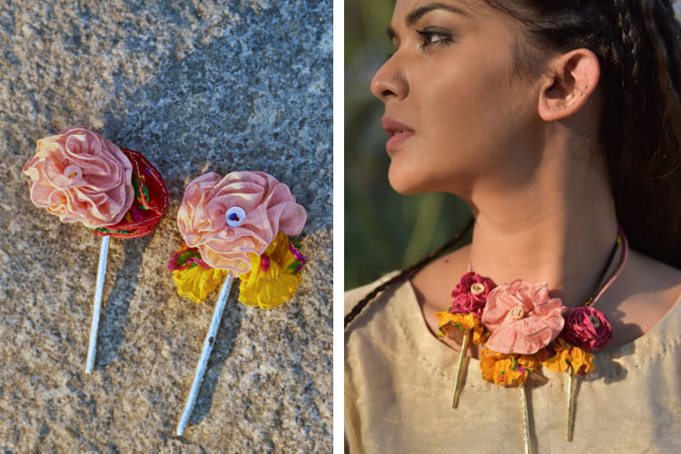 The pieces crafted by Makutu are a tribute to all things wild and free. From delicate chanderi fabrics handrolled to take shape of these gorgeous flowers of spring to parandhis (hair accessories) crafted with mashu fabric, they have a wide range of accessories. Their website has these stunning photos of women with lush blossoms stuck in their ears or parandhi strands worn in their hair, anklets on feet and strands on arms. From roses to lilies and radiant fuchsia blossoms. Prices start from INR 430 for brooches and go up to INR 1,600+ for earrings.