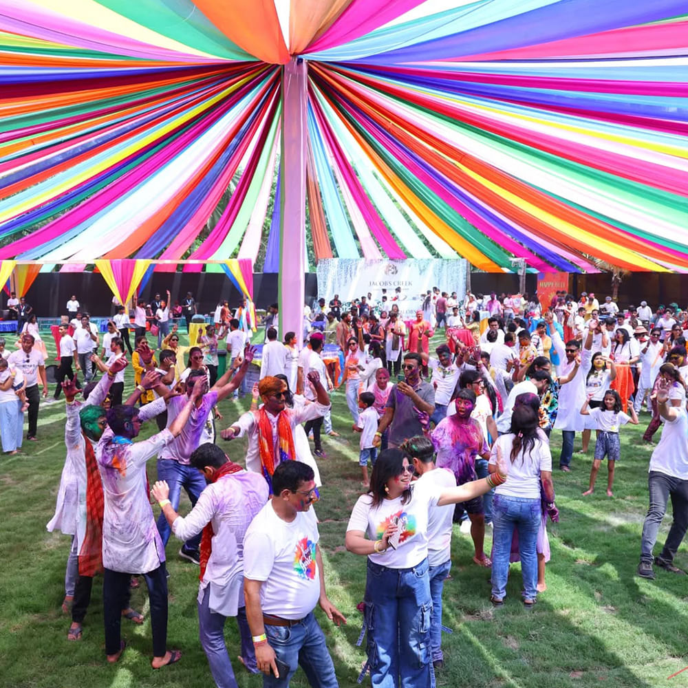 Rain dance, dhol , and an explosion of colour so intense that the sky will turn red! Star DJs throw that dhunuchi-energy beat, fusing foam-flecked mayhem with desi dhoom. Chaats and a lavish Holi buffet will add to the evening as you sip, stir, and cheer with bhang, thandai, and ice gola! A Kids Zone for the chhoto para pros, VIP cabanas for the show, and organic gulaal for the glow! We're going to go big this Holi, so slay, party, and paint the town pink!