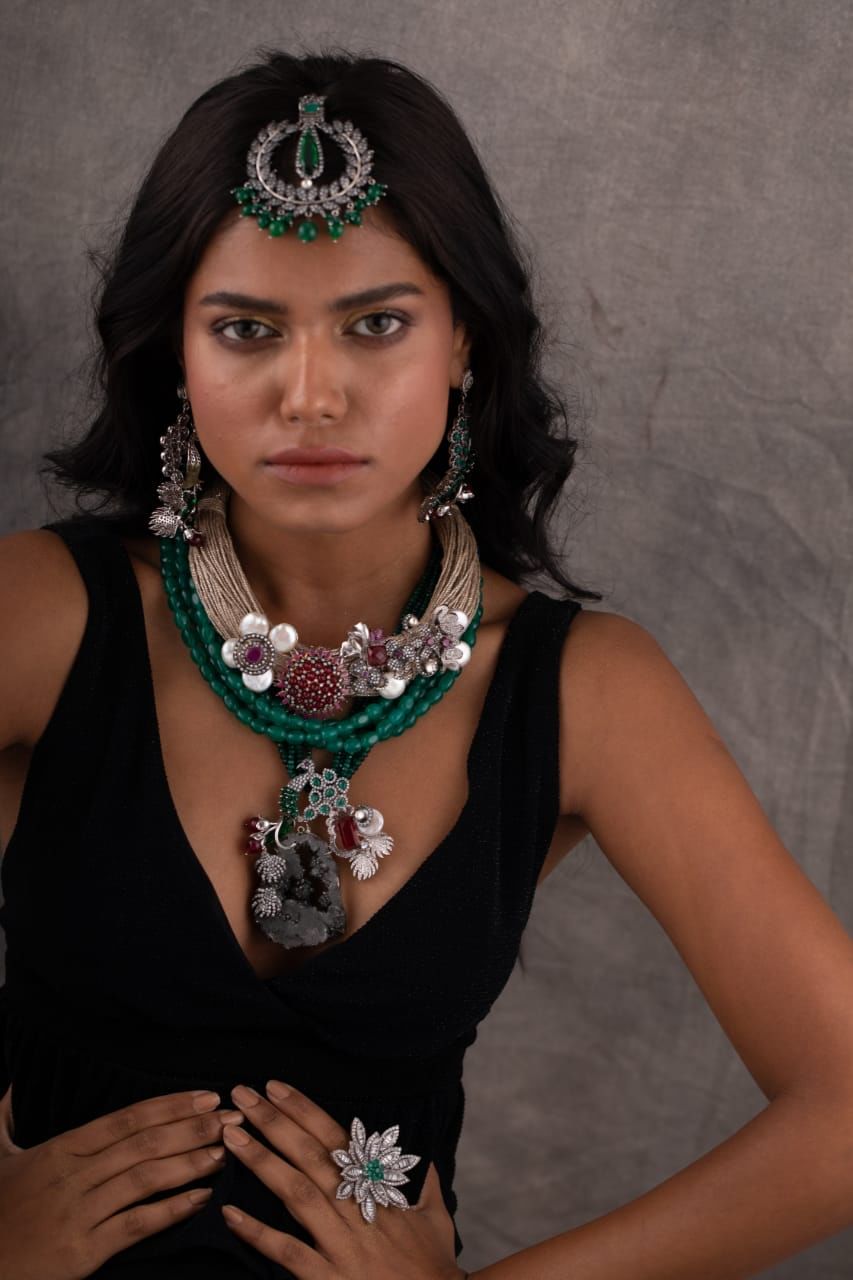 All the pieces, made of mixed metal alloy and authentic gemstones, are designed and manufactured by Rohita herself. She uses gemstones like ruby, emerald, topaz, garnet, turquoise, peridot, opal, jade, freshwater pearls, zircon, and semi-precious stones like malachite, lapis coral agate and amethyst. Another interesting thing is her pieces have elements like wood fabric, shells, old coins and miniature paintings beautifully blended making each piece stand out in the crowd.