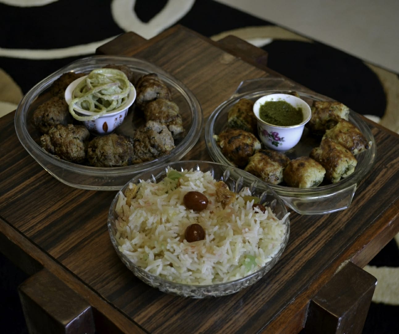 The meal starts with falooda tukhmarein sharbat which is chia seeds soaked in Rooh Afza and paired with falooda. The starters include the melt in the mouth, bite sized softer than the galoutis, mutton dora kebabs and the chutney stuffed tender grilled chicken gola kebabs.