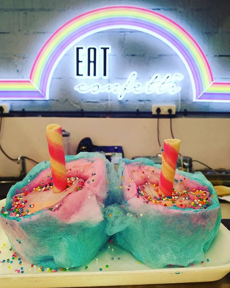 This newly opening dessert parlour is Mulund is the BOMB! They’ve basically taken Buddhi Ke baal a.k.a the Hawa mithai/Cotton candy too seriously and made desserts out of it. There’s Cotton Cloud Icecream, Candy Floss Burritos, Confetti Tacos, Candy crepes etc. Oh and they have waffle pops too!
