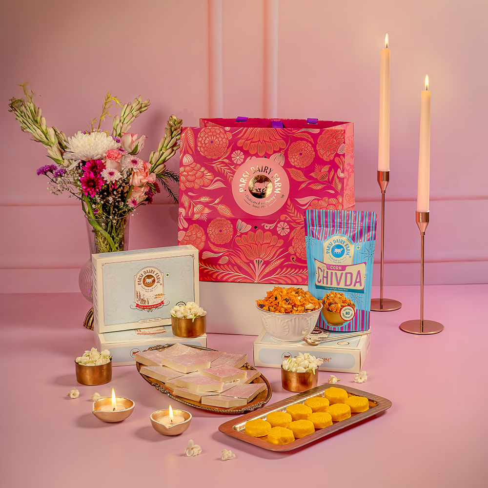 Like always, Parsi Dairy Farm continues to sweeten Diwali with its traditional hampers. Each box is a nostalgic mix of mithais like kaju katli, mawa peda, and suterfeni, alongside chocolate walnut fudge and date squares. You’ll also find savoury staples like corn chivda, cow ghee, milk masala, and more. All of them are classic and comforting.