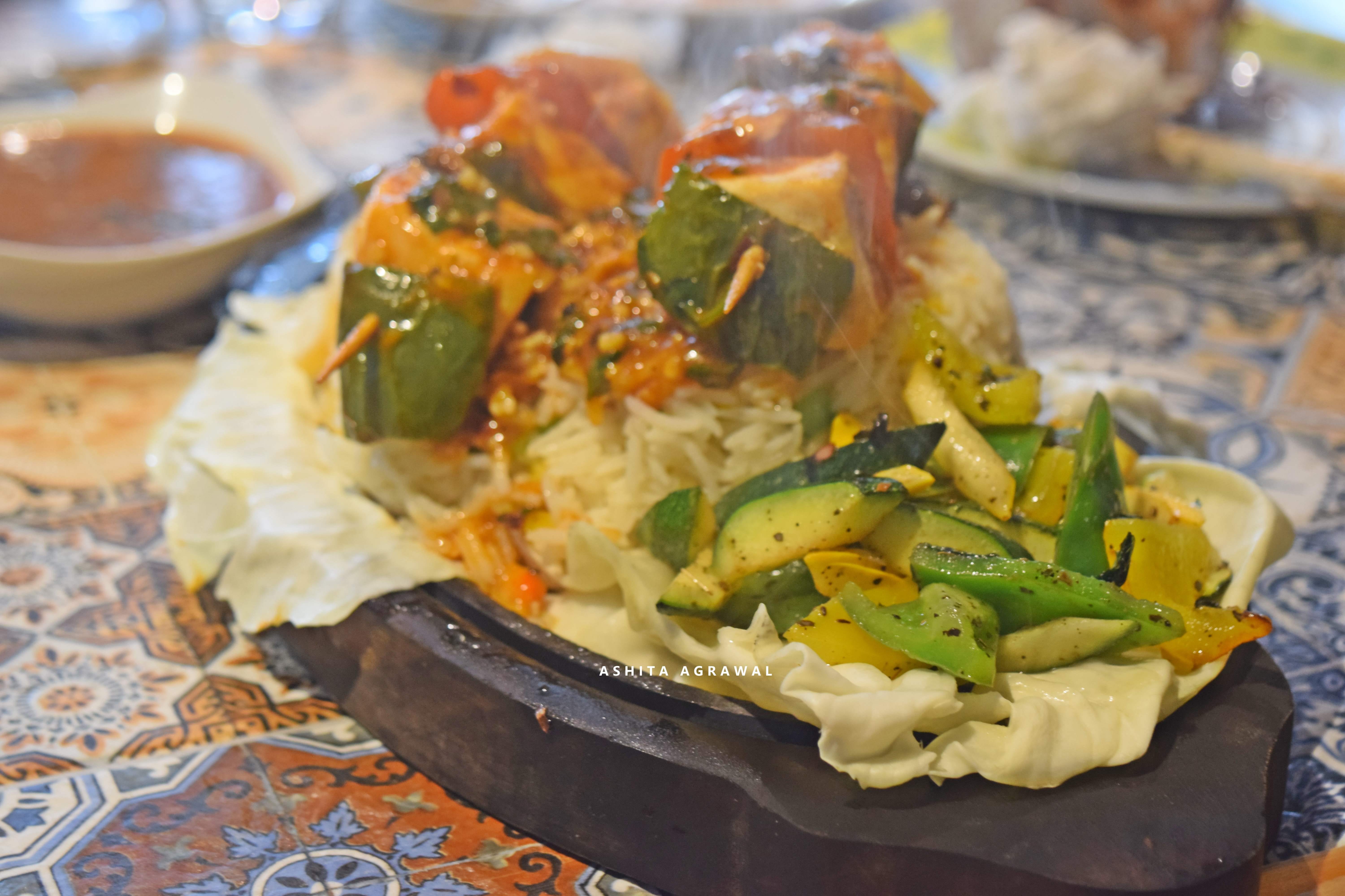 Shaslik veg sizzler - I would rather ask them to name is paneer shashlik sizzler because the hero of the dish was the bbq paneer sticks. It had herbed vegetables, rice, french fries. You can also opt for mashed potatoes instead of rice. It is served along with shashlik sauce. The taste is just superb as every portion compliments each other perfectly.
